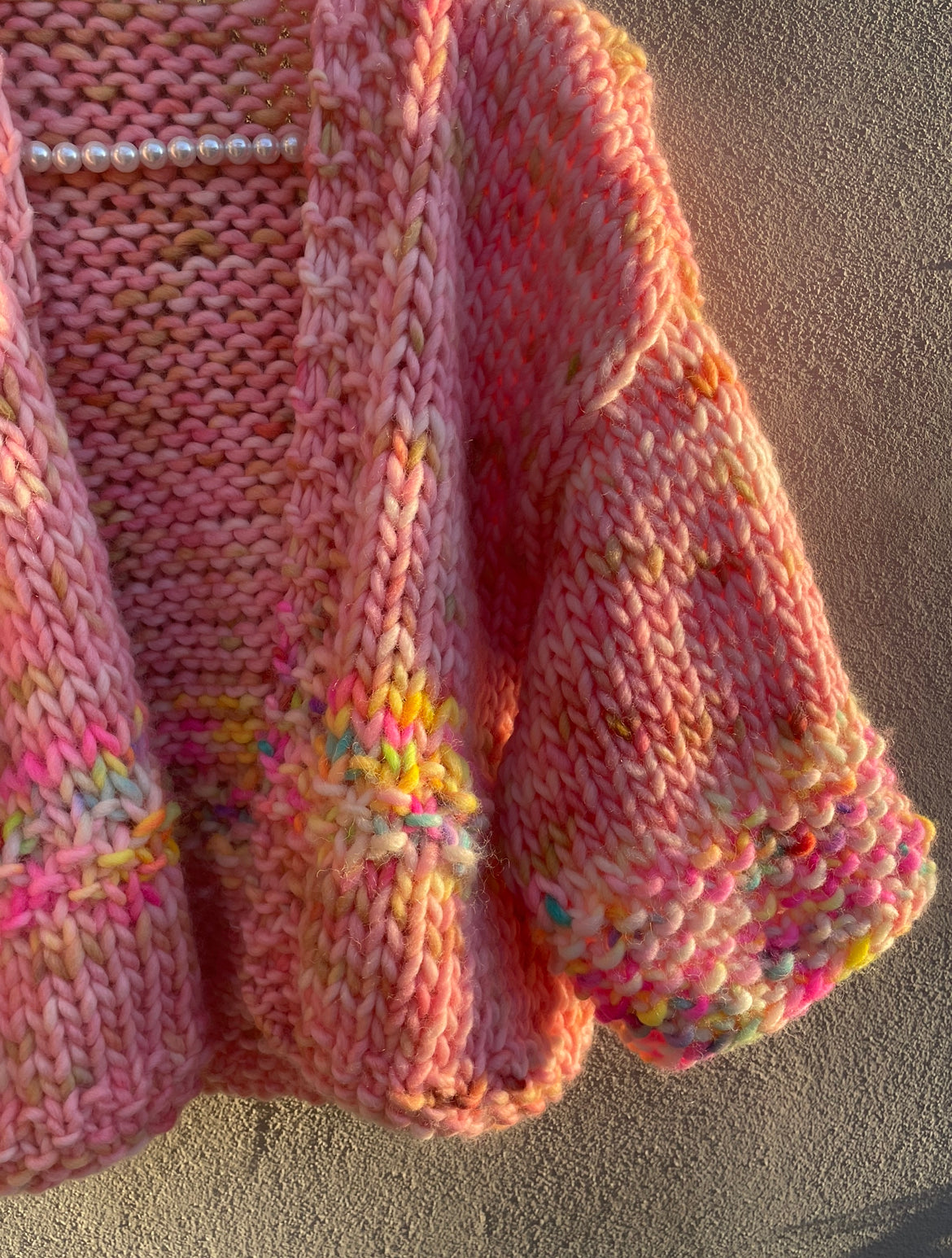 Kort chunky cardigan med fine detaljer i perlestrik.