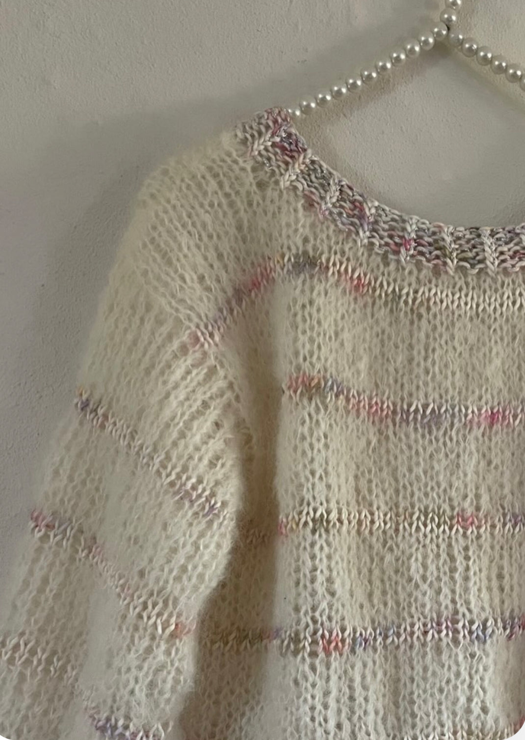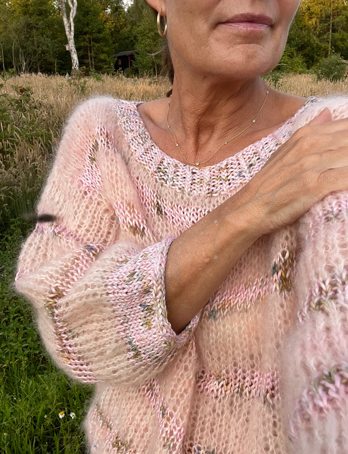 Smuk kombination af chunky mohair med effekter i pima bomuld og tynd sølvtråd i kanterne. Modellen strikkes nedefra op.
