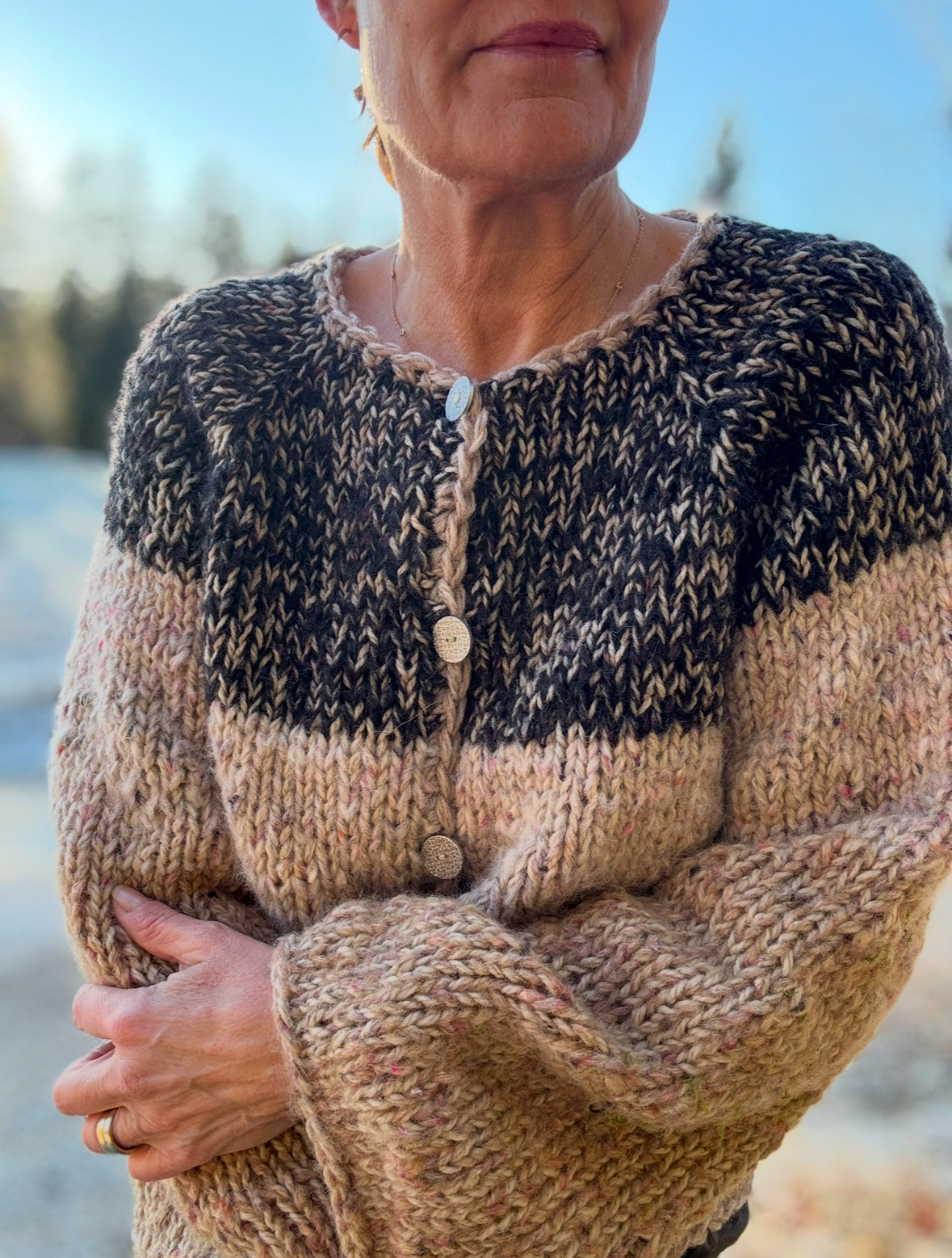Strikket oppefra ned med raglangudtagninger, så længden kan justeres efter ønske.