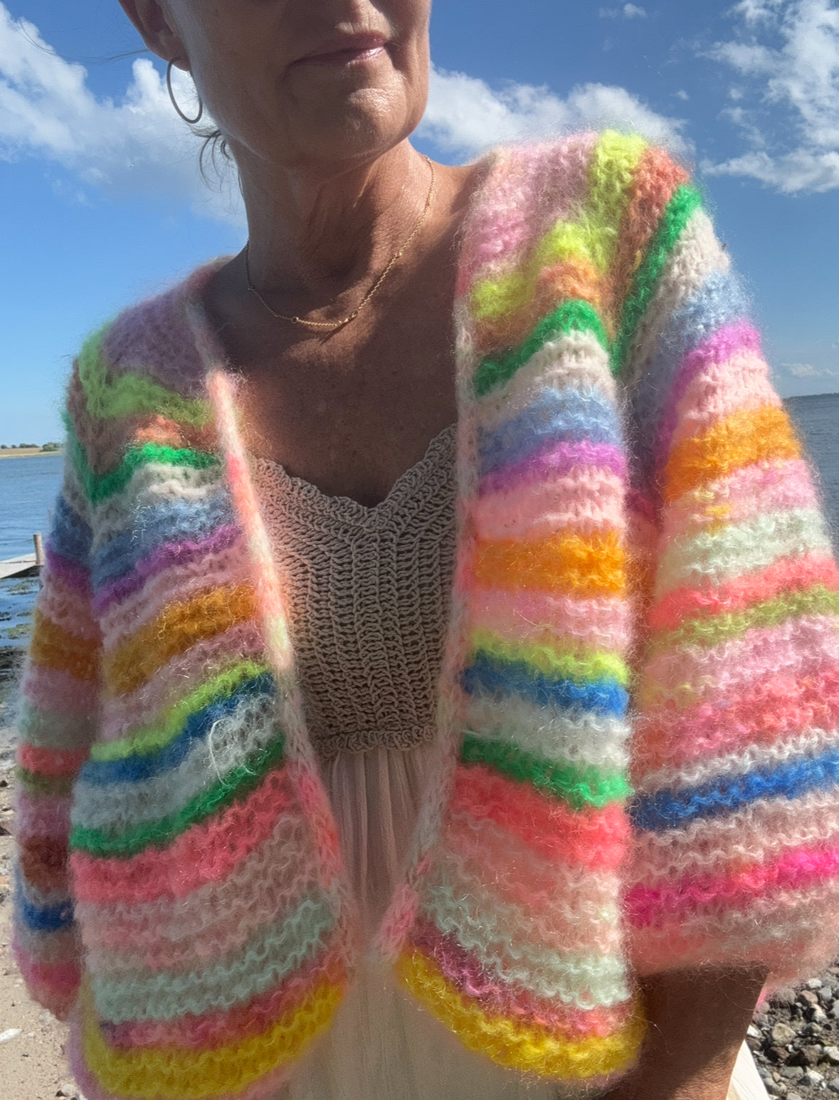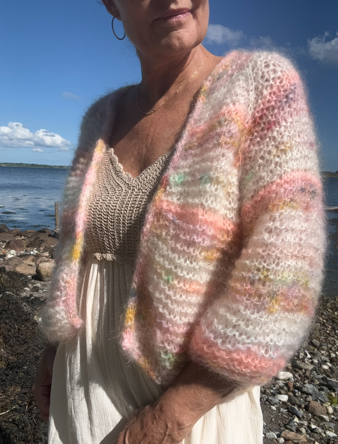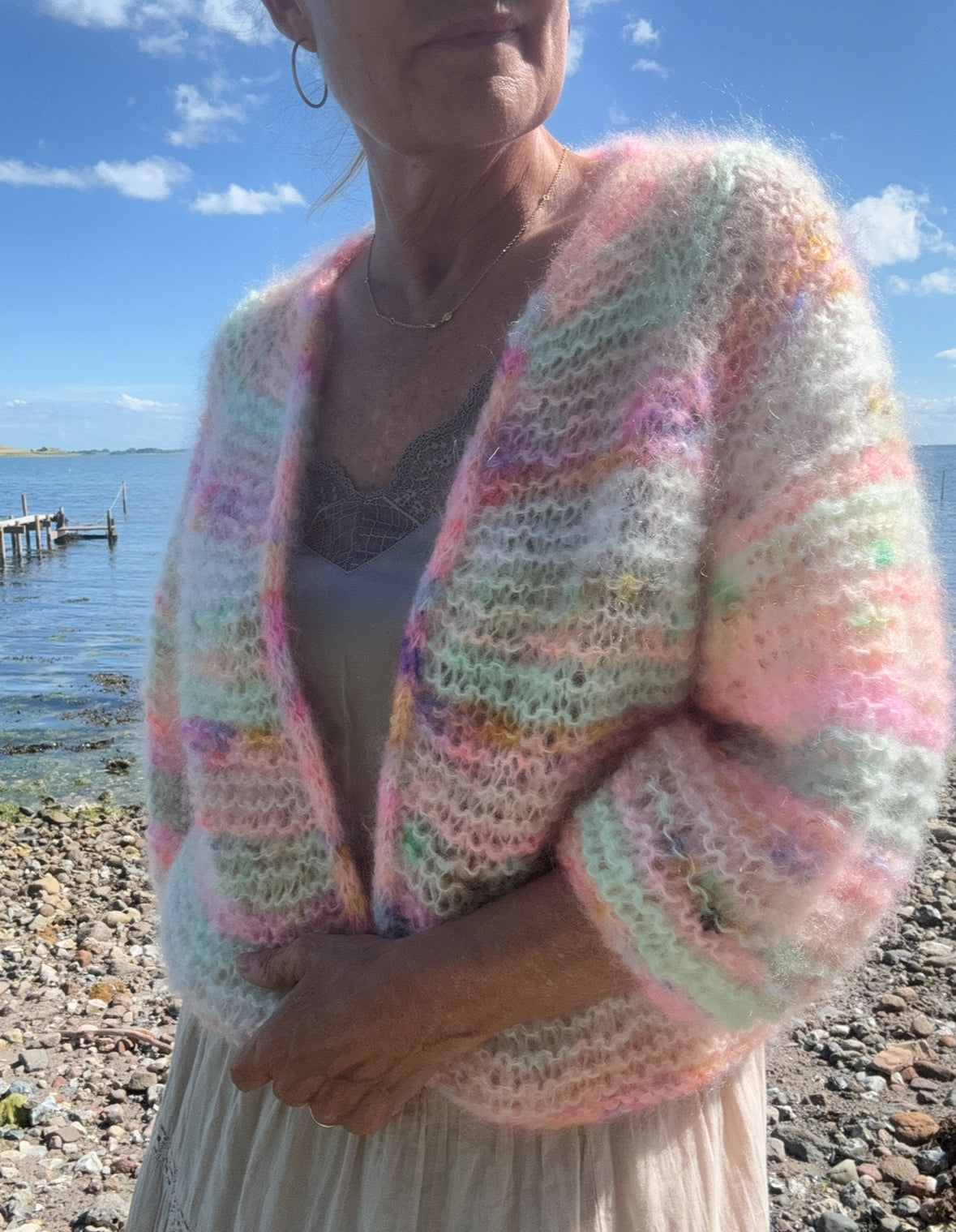 Smuk unik cardigan strikket i mohair rester. Ærmerne er ¾ lange.