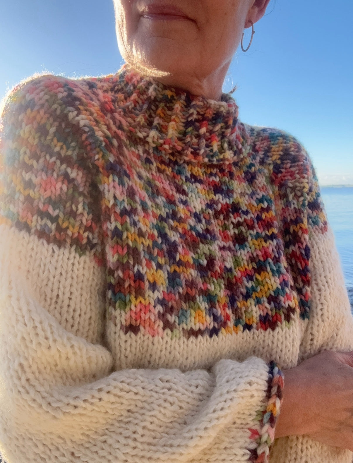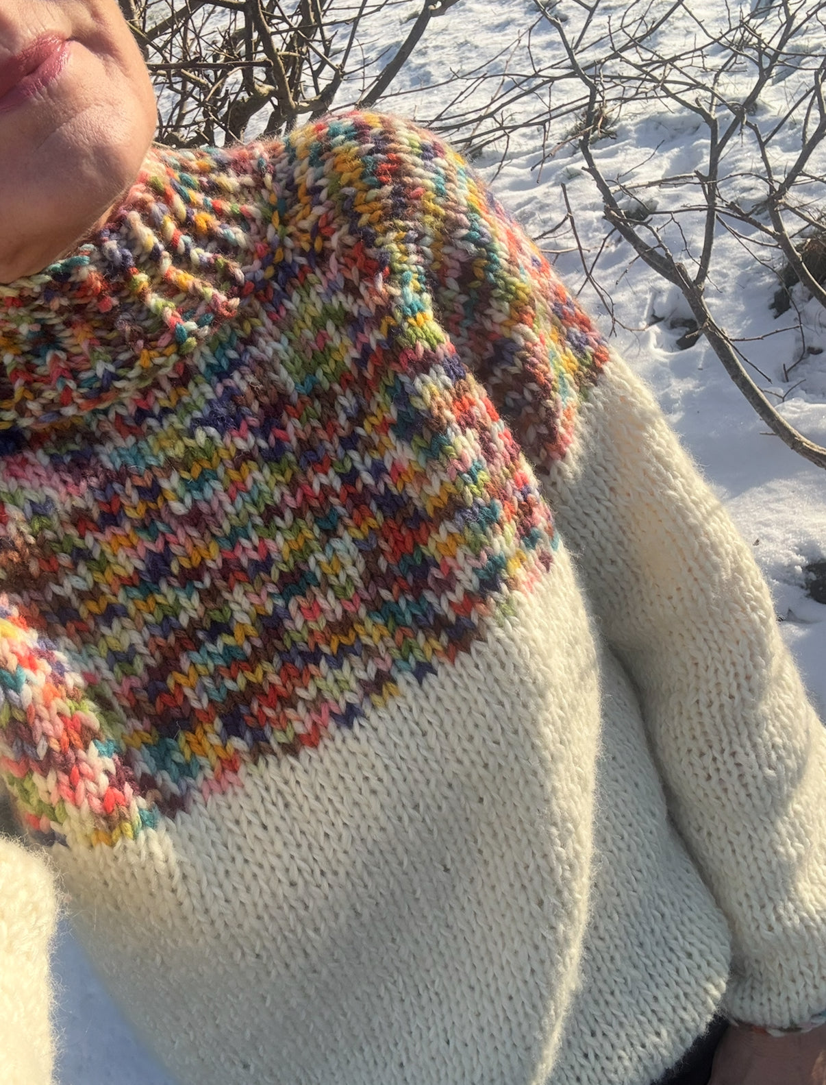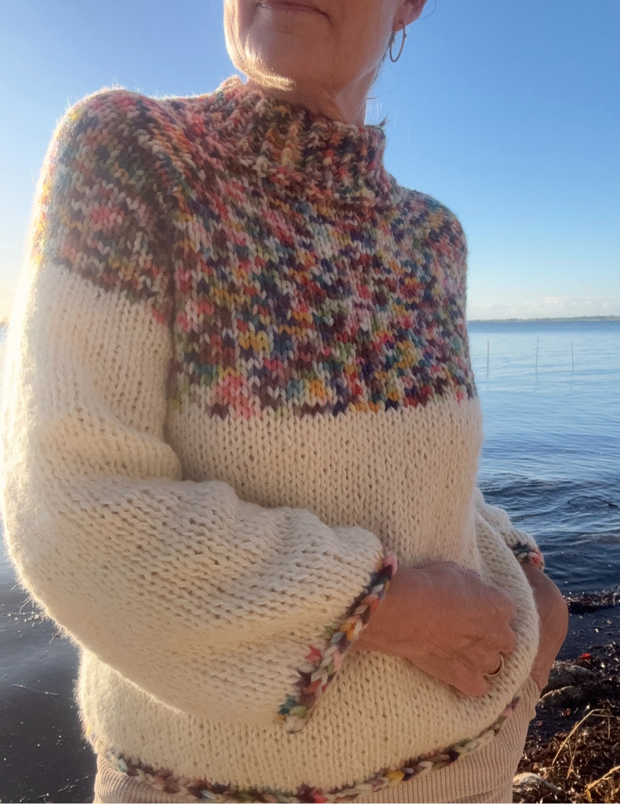 Snygg, enkel stickning med fina detaljer. Stickad i olika garnkvaliteter, vilket ger den ett stilrent utseende. Stickad uppifrån och ner med raglanminskningar, så att längden kan justeras efterhand efter eget tycke. Modellen är i one size.